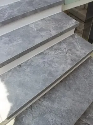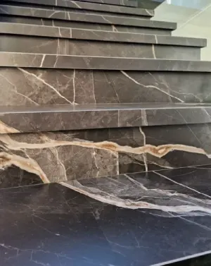 Showcasing our ability to engineer a continuous natural grain across multi-planar surfaces. We utilize precision-matching technology to ensure that large-format natural stone patterns flow seamlessly from tread to riser, creating a structurally cohesive, singular stone block aesthetic.