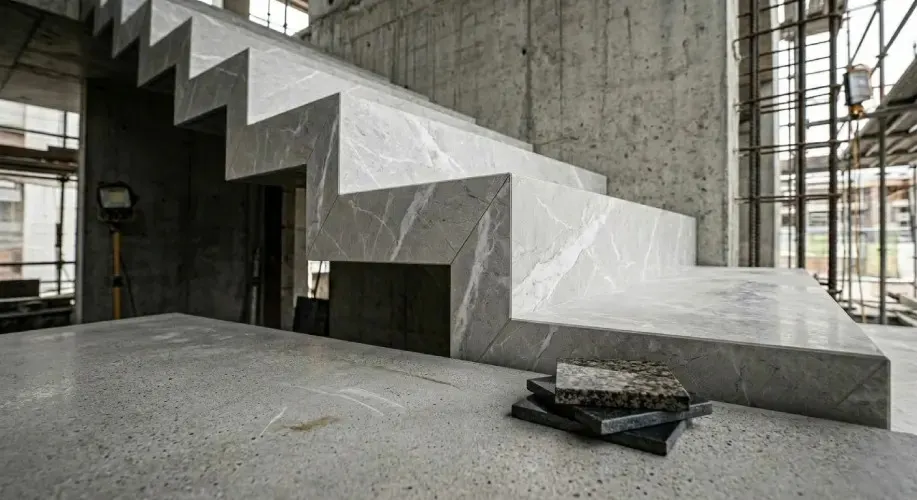 An ‘in-progress’ look at the technical engineering required for zig-zag stair structures. We specialize in the complex calculation and cutting of large-format slabs to wrap around structural concrete or steel, ensuring that every mitered joint is a high-stress, durable connection that maintains architectural intent.