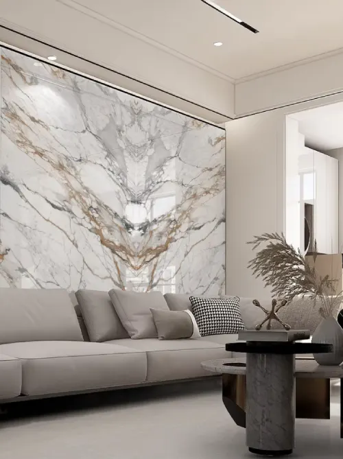 Transform your living space with floor-to-ceiling stone cladding that mirrors natural patterns for a work-of-art effect. This seamless, grout-free finish adds a sense of luxury to any room.