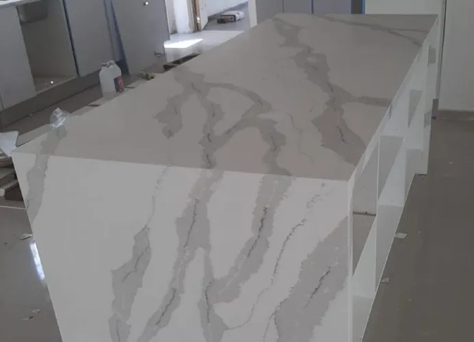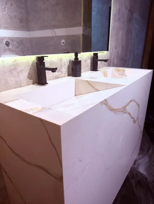 Experience the ultimate in stone engineering with this breathtaking Calacatta Gold project. Expertly vein-matched across surfaces and integrated sinks, this engineered stone creates a flawless, monolithic appearance. Bringing the timeless beauty of Italian marble into your home, it offers the superior strength and durability of modern quartz.