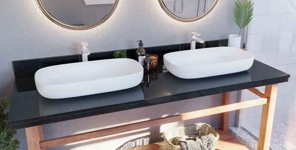 Add a touch of starlit luxury with Enduro Quartz Galaxy. Its deep black surface, delicately infused with a subtle shimmer, creates a striking and durable foundation for double vessel basins. Precision stone cutting ensures a high-gloss, waterproof finish, transforming any double vanity into a bold and sophisticated design statement.