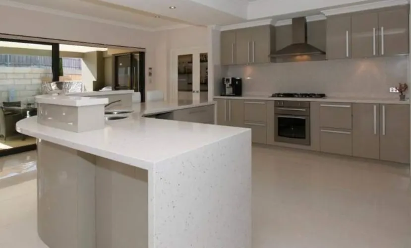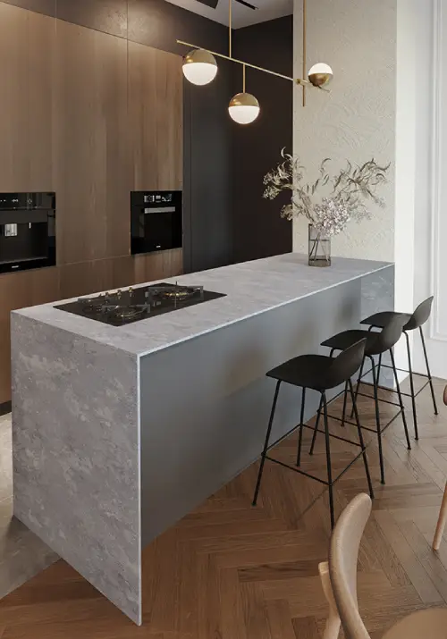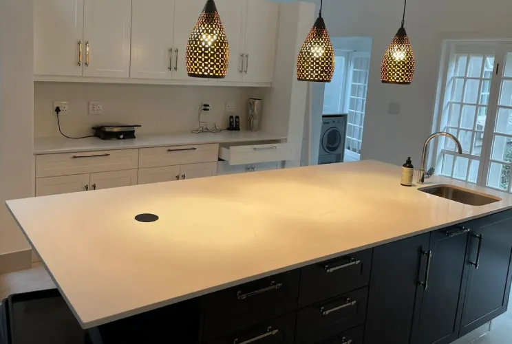 For this minimalist open-plan kitchen, a wide island and breakfast bar were installed using Eezi Quartz Sparkle. Designed for durability and thermal resistance, the surface maintains its refined glow even under daily use. This project highlights precise craftsmanship across expansive, contemporary stone surfaces.