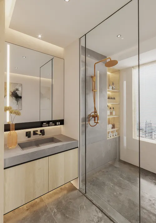 Carefully crafted, this sophisticated, warm-toned sanctuary features Enduro Quartz Fawn. The integrated stone basin and thick-profile vanity create a seamless, contemporary look that is both elegant and easy to maintain. An ideal choice for homeowners seeking a minimalist yet inviting quartz bathroom finish.
