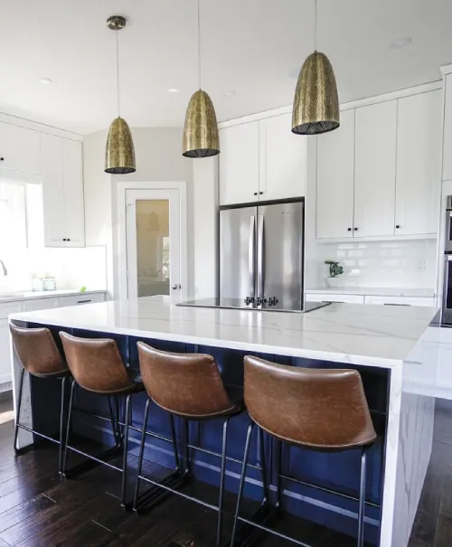 Make a definitive design statement with high-contrast sophistication. This kitchen uses a waterfall-edge island that cascades like a solid glacier of brilliant white, offering a dramatic break against dark, moody cabinetry. The seamless, geometric precision of the stone creates a powerful, architectural look that is both modern and timelessly elegant.